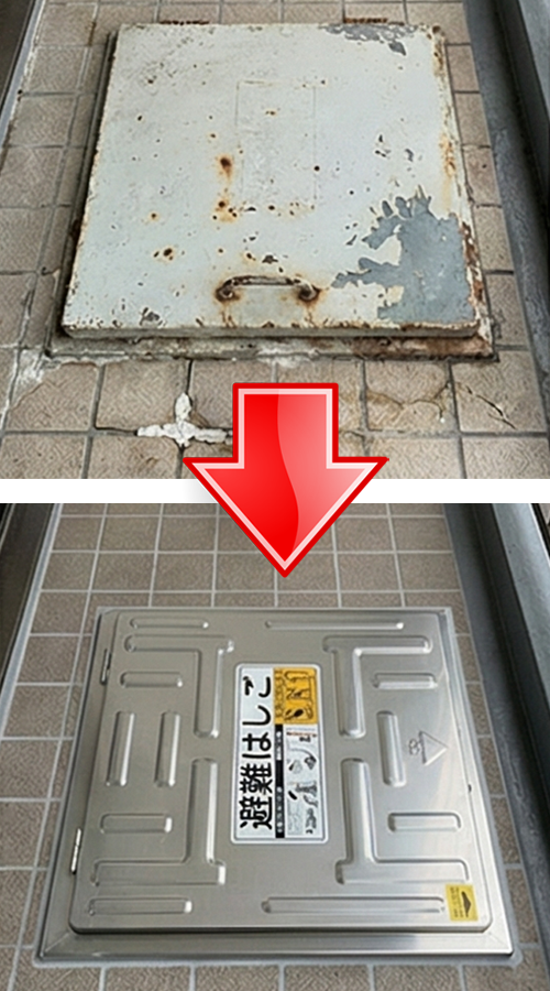 蓋を開ける機会があまりない避難ハッチ。外観がこのような状態だとハッチ工事が必要です。