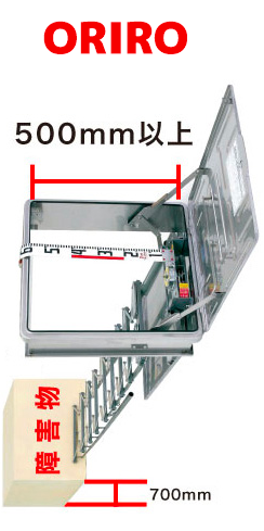 オリローは階下にまっすぐ伸びるスライド式はしご(国家検定合格品)を採用しています。スライド式は他社のパンタグラフ式と違い、階下に障害物があっても降下口を広くとれるので安心です。