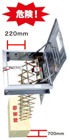 パンタグラフ式は降下口が220mmと狭く、スムーズな避難は不可能です。